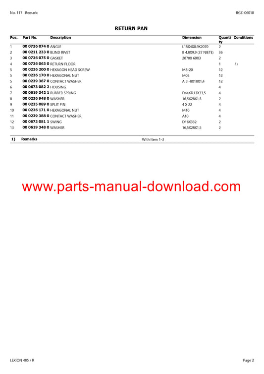 Claas 485 R Combine Lexion (North America) Parts Catalog Manual Instant Download